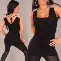 Sexy Damen Long-Top Wasserfall-Look Strass-Optik Schwarz