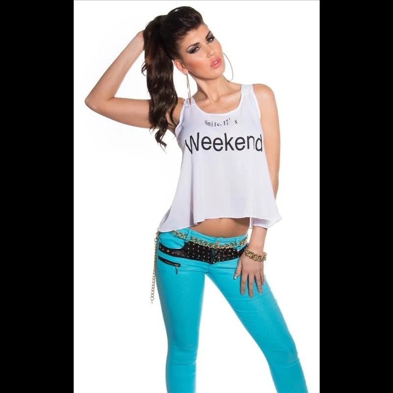 - Süßes Top aus transparentem Chiffon mit schwarzem Print „Smile, IT’s Weekend“ auf der Vorderseite